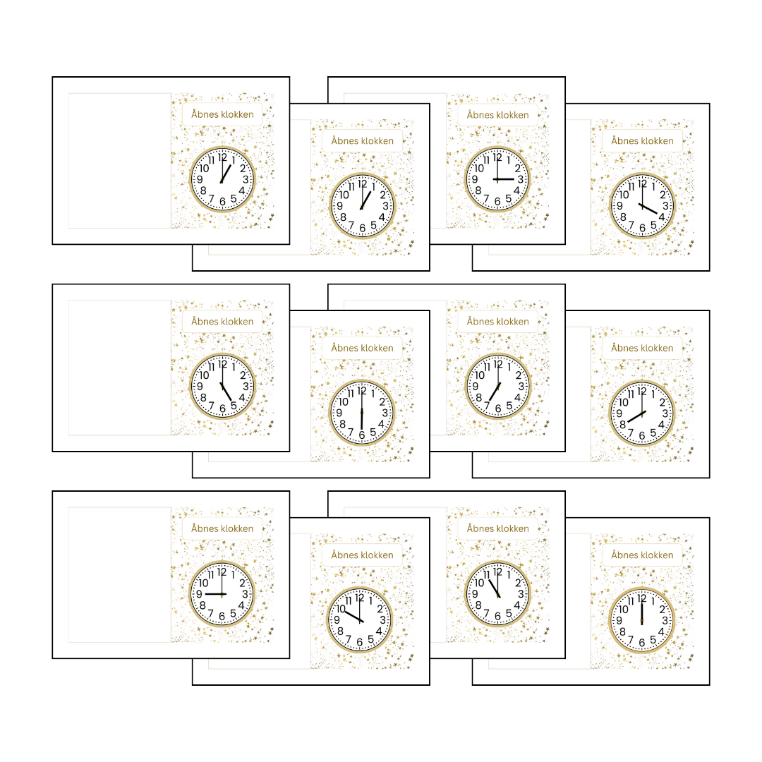 • 12 x ‘Åbnes kl……..’ kort, der kan bruges til timeaktiviteterne.