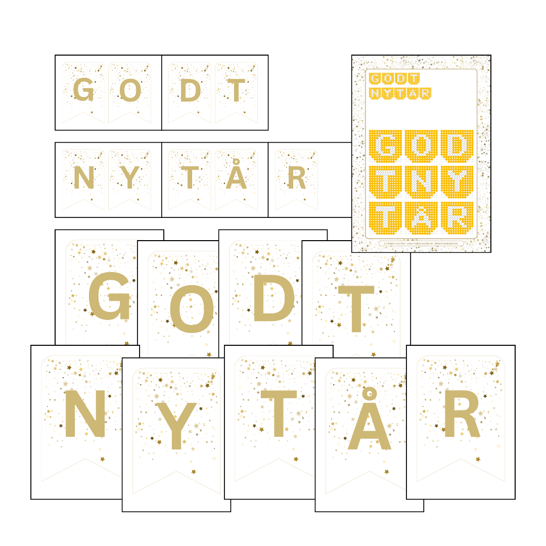• Flag med G – O – D – T – N – Y – T – Å – R til at pynte op. I 2 størrelser.